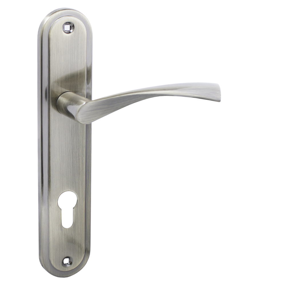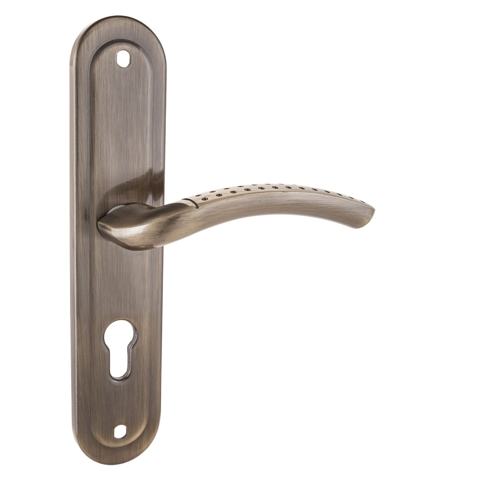 Фурнитуру собирают в виде накладки с отверстием под замок (или с запорной вертушкой) и ручкой. В отличие от варианта на розетке, состоящего из двух отдельных частей, здесь все элементы собраны в сплошной нажимной гарнитур — это второе название для ручек–планок.